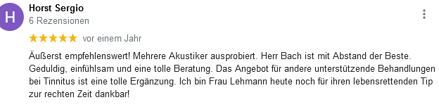 "Das Gesamtkonzept von Herrn Bach überzeugt in allen Bereichen. Neben einer umfassenden Diagnostik nimmt die Information der eigenen Symptomatik einen großen Stellenwert ein. Das Ohrgeräusch hat sich messbar verbessert und ist für mich nur noch sehr selten und wenn nur sehr leise hörbar. Meine Lebensfreude ist wieder da."